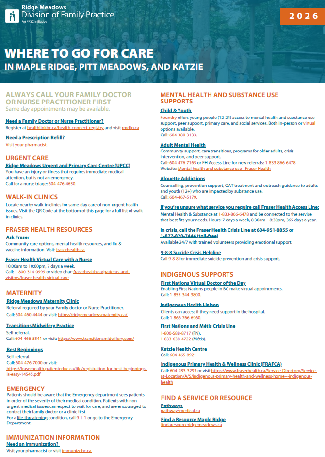 Register at healthlinkbc.ca/health-connect-registry and visit findadoctorridgemeadows.ca.
